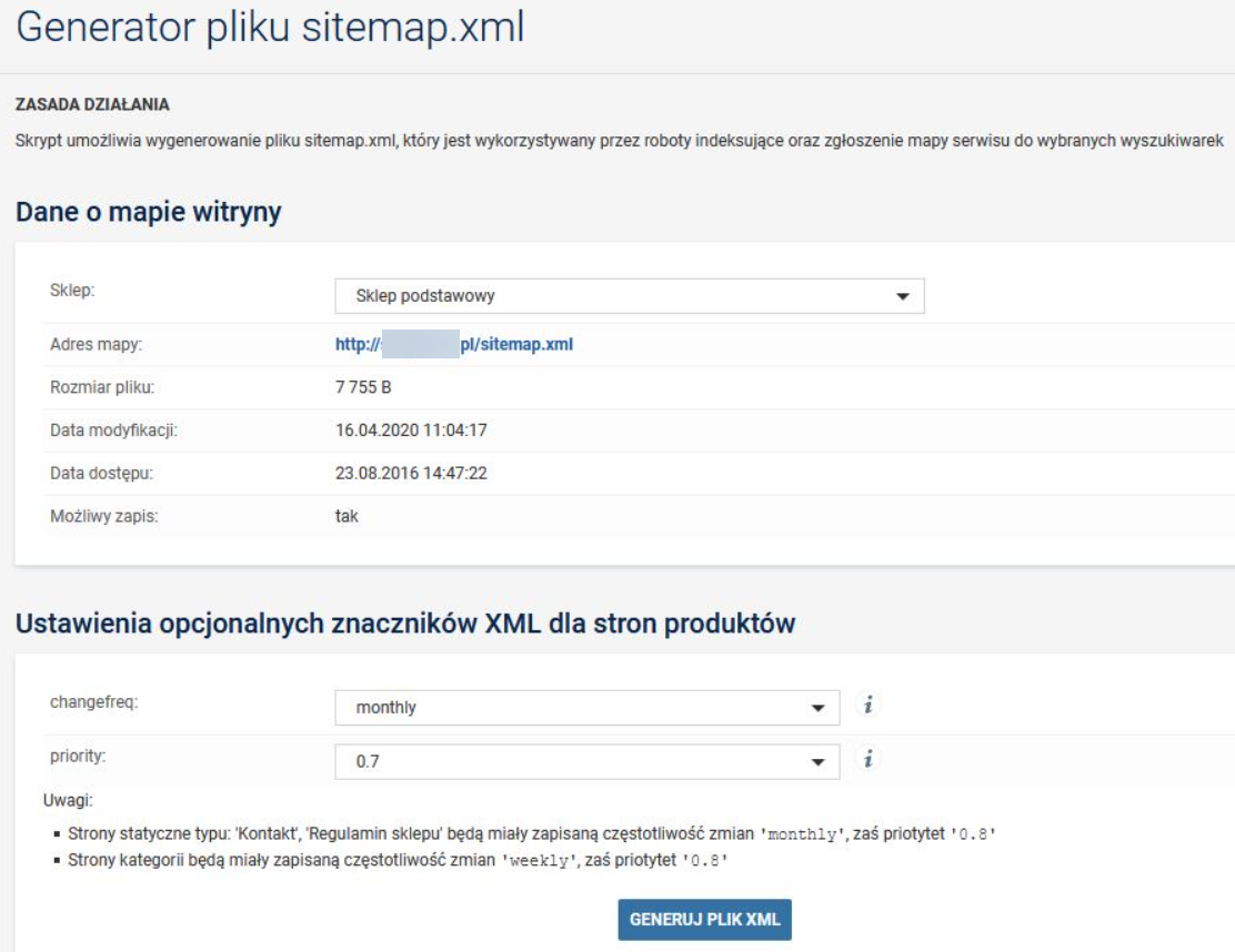 – A przyciskiem „Generuj plik XML” wysyłasz na serwer gotową sitemape. W wierszu „Adres mapy:” znajduje się link prowadzący do mapy witryny, który możesz zgłosić w Google Search Console.